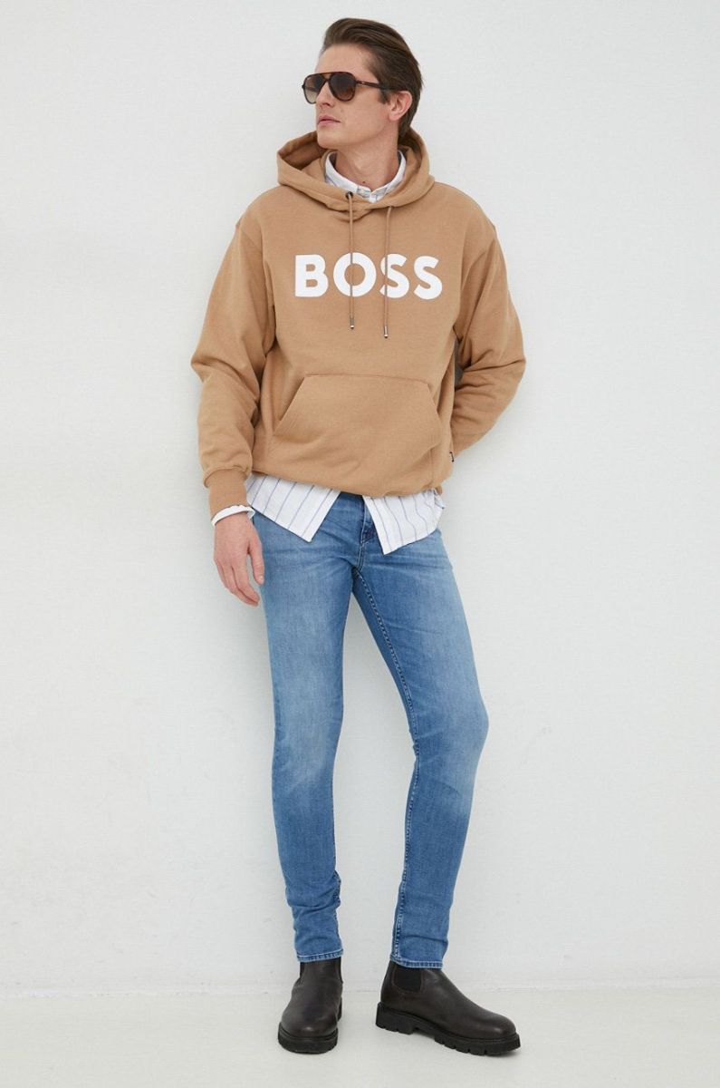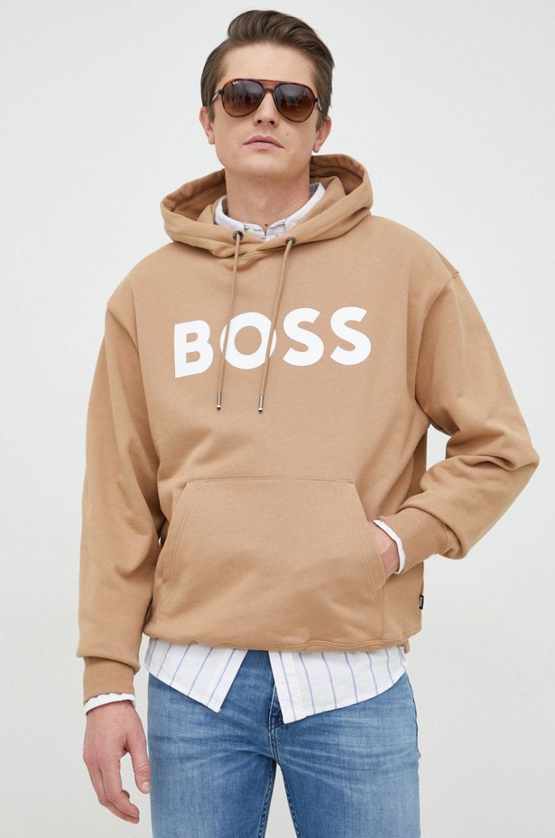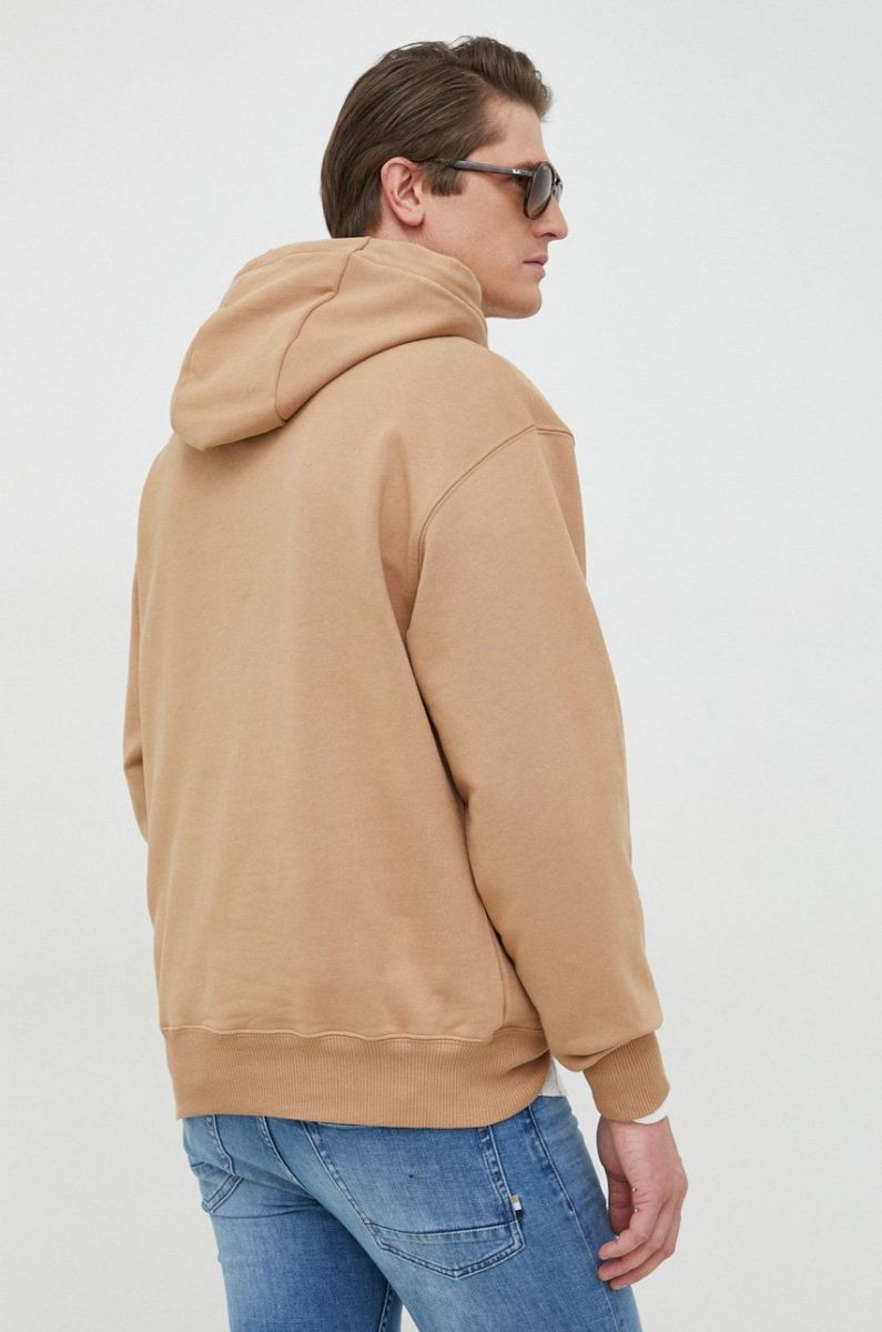 Бавовняна кофта BOSS чоловіча колір бежевий з капюшоном з принтом (2873759)
