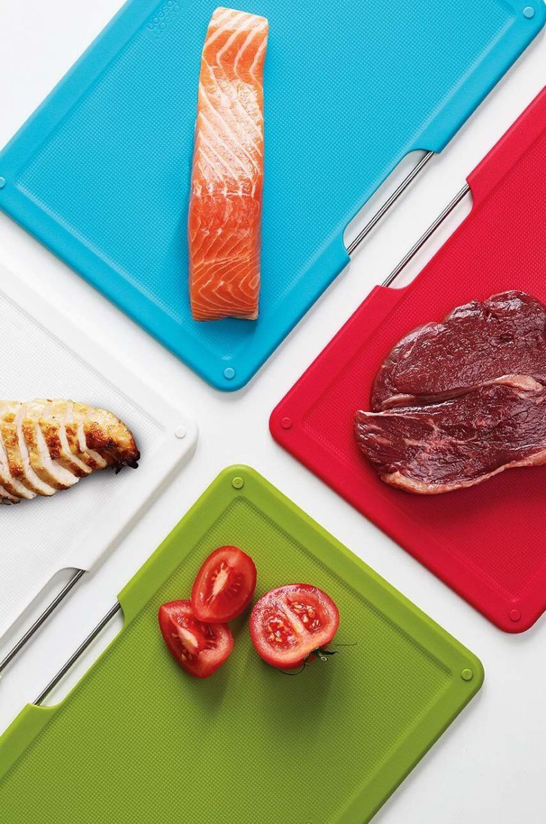 - Дошки означені кольорами, що дозволяє призначати їх для нарізання певних продуктів, наприклад, сирого м’яса, овочів, риби або хліба.