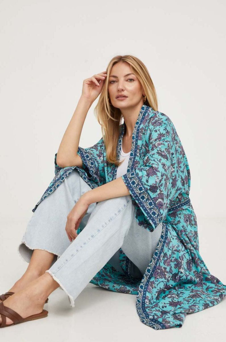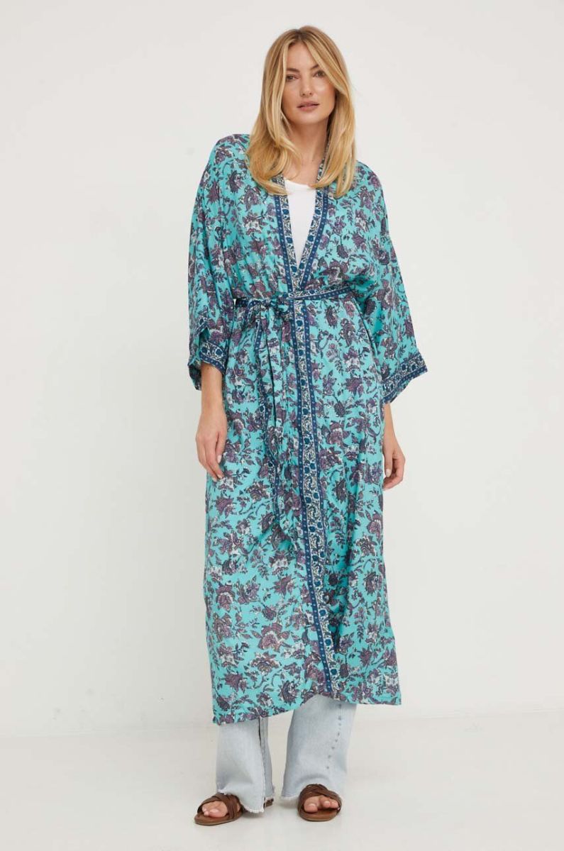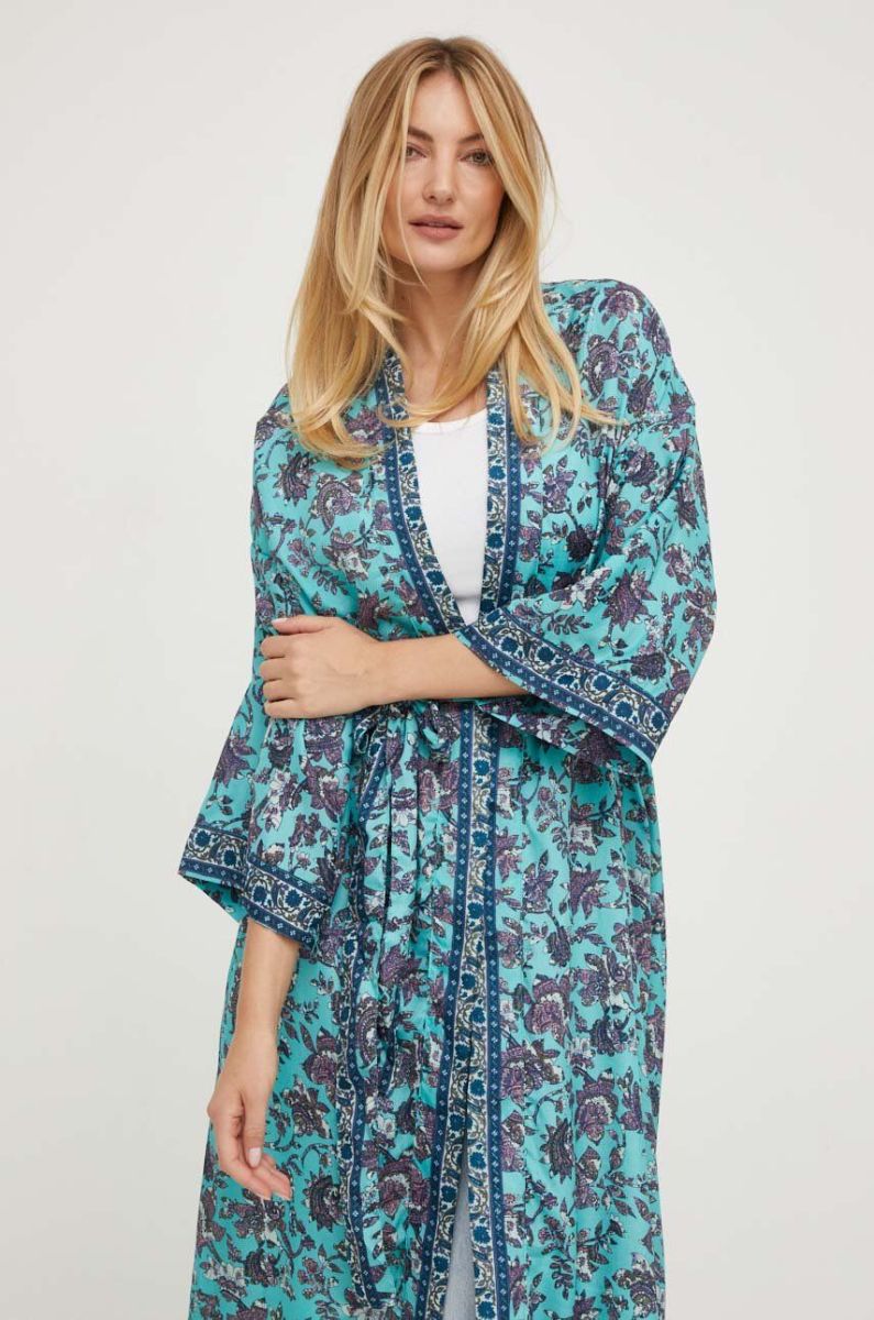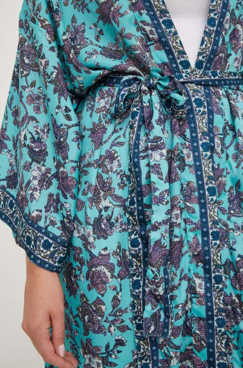Шовкове кімоно Answear Lab без застібки візерунок колір блакитний