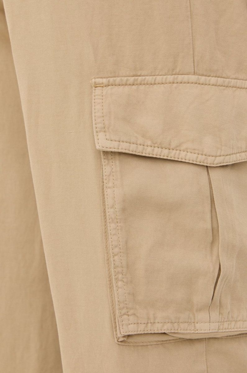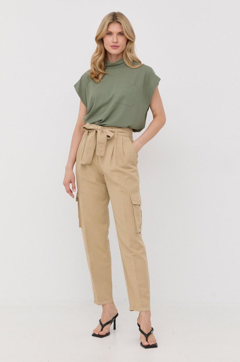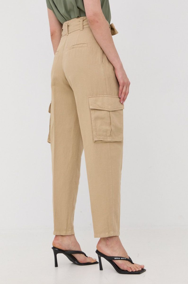 Штани з домішкою льону HUGO жіночі колір бежевий фасон cargo висока посадка