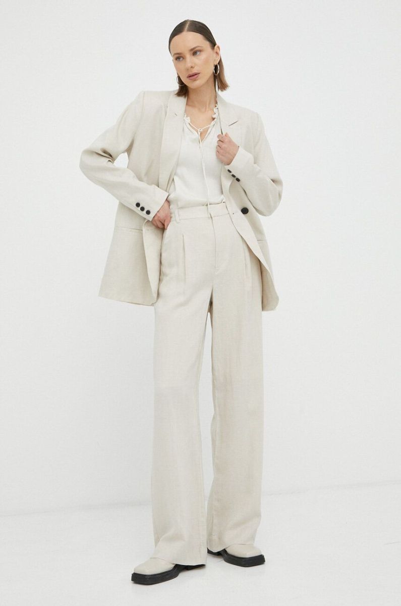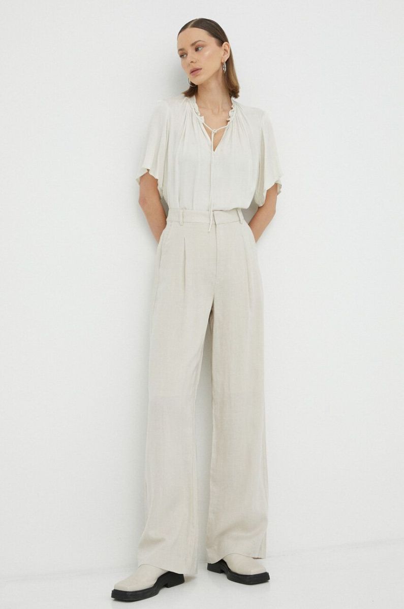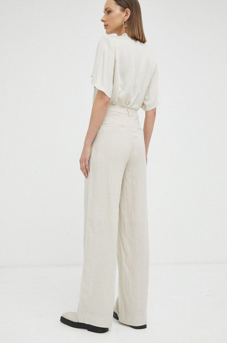 Штани з льоном Gestuz Paula колір бежевий широкі висока посадка